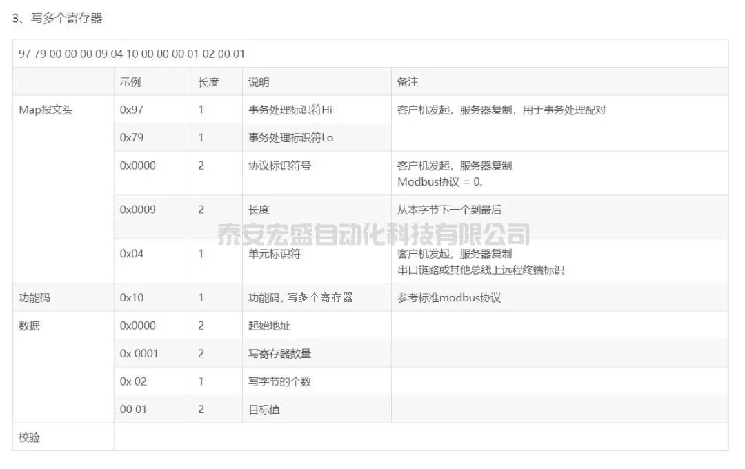 請(qǐng)求:MBAP 功能碼 起始地址H 起始地址L 寄存器數(shù)量H 寄存器數(shù)量L(共12字節(jié)) 響應(yīng):MBAP 功能碼 數(shù)據(jù)長度 寄存器數(shù)據(jù)(長度:9+寄存器數(shù)量×2) 如:起始地址是0x0000,寄存器數(shù)量是 0x0003