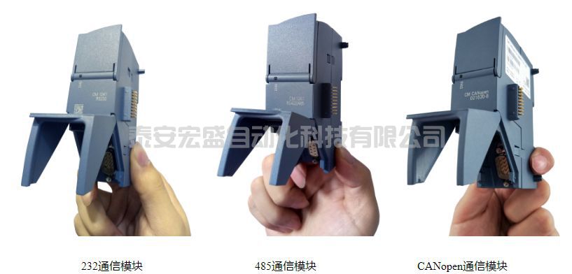 PLC 要想控制驅(qū)動(dòng)器就要向它發(fā)送指令數(shù)據(jù)。低端驅(qū)動(dòng)器可以用模擬量或者脈沖信號(hào)傳遞數(shù)據(jù),高端驅(qū)動(dòng)器則采用規(guī)范的通信協(xié)議傳遞數(shù)據(jù),這樣的通信可以借助 RS-232、RS-485、CAN、EtherCAT 等協(xié)議實(shí)現(xiàn)。因?yàn)?S1200 的 CPU 模塊沒(méi)有這些通訊接口,所以要想連接驅(qū)動(dòng)器,需要購(gòu)買額外的通信模塊(CM:Communication Module)。上面提到的幾種協(xié)議西門(mén)子都有對(duì)應(yīng)的通信模塊支持,比如西門(mén)子的 232 、485 和 CANopen 通信模塊如下圖所示(這三種模塊外形完全一樣),注意 232 和 CANopen 模塊的插頭是公頭,而485的則是母頭。