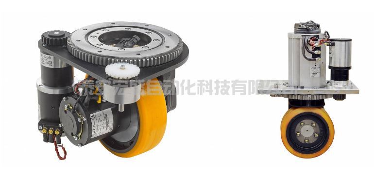 舵輪是個(gè)高度集成的移動(dòng)機(jī)構(gòu),由車輪、回轉(zhuǎn)支撐、齒輪箱、驅(qū)動(dòng)電機(jī)、轉(zhuǎn)向電機(jī)、編碼器、限位開(kāi)關(guān)、制動(dòng)器等部件組成,它既能提供牽引力,也可以主動(dòng)轉(zhuǎn)向,因此一個(gè)舵輪有兩個(gè)自由度。AGV 使用一個(gè)或以上的舵輪就可以實(shí)現(xiàn)全向移動(dòng):原地旋轉(zhuǎn)、斜行、橫移等等。舵輪一般用于室內(nèi)環(huán)境,所以輪面的材料多為聚氨酯。根據(jù)電機(jī)的安裝位置可以將舵輪分為兩種:臥式和立式,分別如下兩圖所示。臥式舵輪的驅(qū)動(dòng)電機(jī)橫向安裝,因此整體高度很低,有些AGV對(duì)高度有要求(例如潛入式的AGV要很矮才能鉆到貨物底下),這時(shí)就適合使用臥式舵輪;立式舵輪的驅(qū)動(dòng)電機(jī)豎著安裝,其整體高度偏高,它的優(yōu)點(diǎn)是方便將電機(jī)隔離起來(lái),在有些場(chǎng)合(例如危險(xiǎn)品工廠),要求舵輪電機(jī)與外部環(huán)境隔離,這時(shí)就適合使用立式舵輪。國(guó)外主要的舵輪生產(chǎn)廠家有:意大利的 CFR 和德國(guó)的 schabmuller(夏伯穆勒),后來(lái)從CFR中又獨(dú)立出來(lái)了一個(gè)廠家——馬路達(dá)。這些舵輪生產(chǎn)廠家一般只賣舵輪,不提供驅(qū)動(dòng)器,驅(qū)動(dòng)器則由代理商提供。一臺(tái)AGV上最貴的部件就是舵輪,以一臺(tái)成本10萬(wàn)元左右的AGV為例,如果配備兩個(gè)舵輪,就需要4~5萬(wàn)元,占整車成本將近一半。不過(guò)好消息是,國(guó)內(nèi)的舵輪廠家開(kāi)始參與競(jìng)爭(zhēng),這將降低AGV的成本。