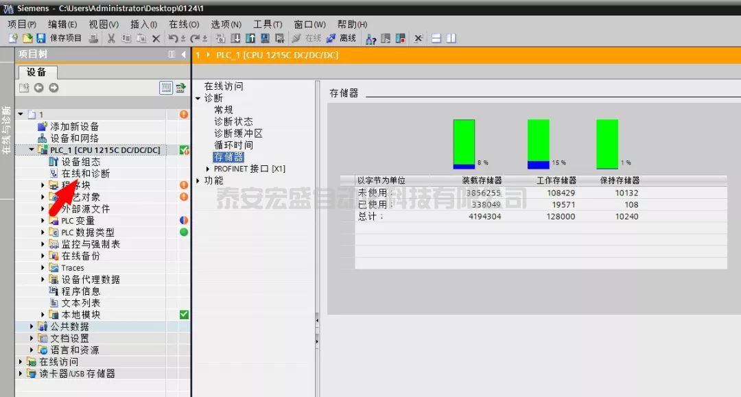 ??我們用電腦連接上PLC,然后在博途軟件左側(cè)欄雙擊“在線和診斷”,然后在打開(kāi)窗口中點(diǎn)擊“存儲(chǔ)器”,如下圖所示。