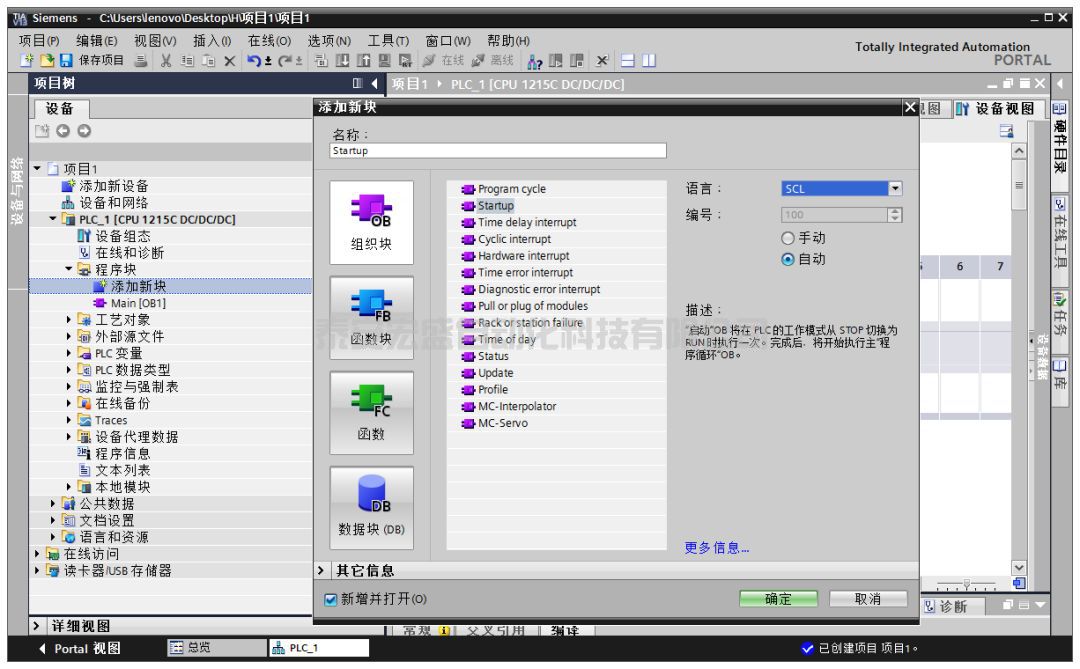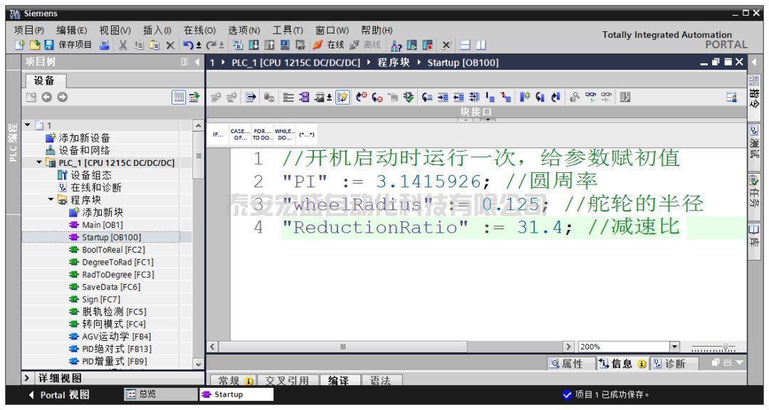 ??有些量我們要經(jīng)常使用(例如圓周率 π \piπ),如果每次都用數(shù)值來(lái)做運(yùn)算一方面輸入很容易出錯(cuò),另一方面如果想對(duì)其進(jìn)行更改那要改很多處,非常繁瑣。一個(gè)方便的做法是將其定義為一個(gè)全局的“常數(shù)”。使用 PLC 和 C 語(yǔ)言等高級(jí)語(yǔ)言相同的一點(diǎn)是,你需要為變量分配內(nèi)存地址。分配好地址后如何對(duì)其賦值呢?因?yàn)槌A恐恍枰x一次值即可,所以我們選擇在 Startup 塊中對(duì)其賦值。Startup 塊在每次 PLC 上電后只執(zhí)行一次。西門(mén)子中有些塊的序號(hào)是系統(tǒng)預(yù)留的,比如 Startup 就是 OB100。我們注意到,在博圖軟件中,全局變量用雙引號(hào)表示(例如"PI"),而局部變量前面帶個(gè)井號(hào)(下面會(huì)碰到)。
