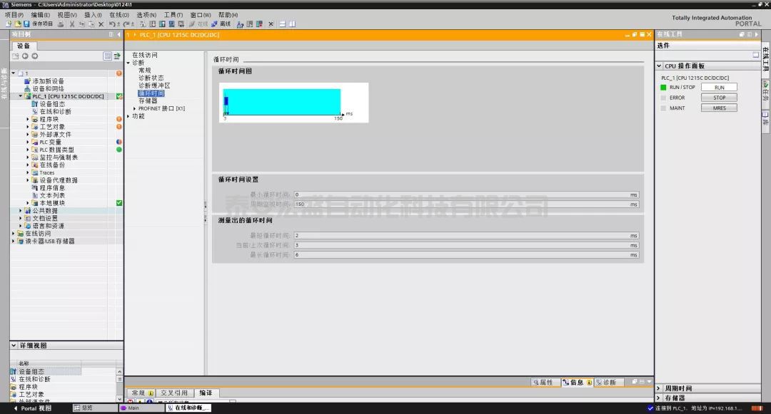 ??PLC會(huì)自動(dòng)記錄時(shí)間,在同一頁(yè)面,打開(kāi)“循環(huán)時(shí)間”,就能看到PLC完整執(zhí)行一遍程序需要的時(shí)間,如下圖所示。這個(gè)時(shí)間不是固定的,取決于你的程序長(zhǎng)短,一般的執(zhí)行時(shí)間在3毫秒以內(nèi)。