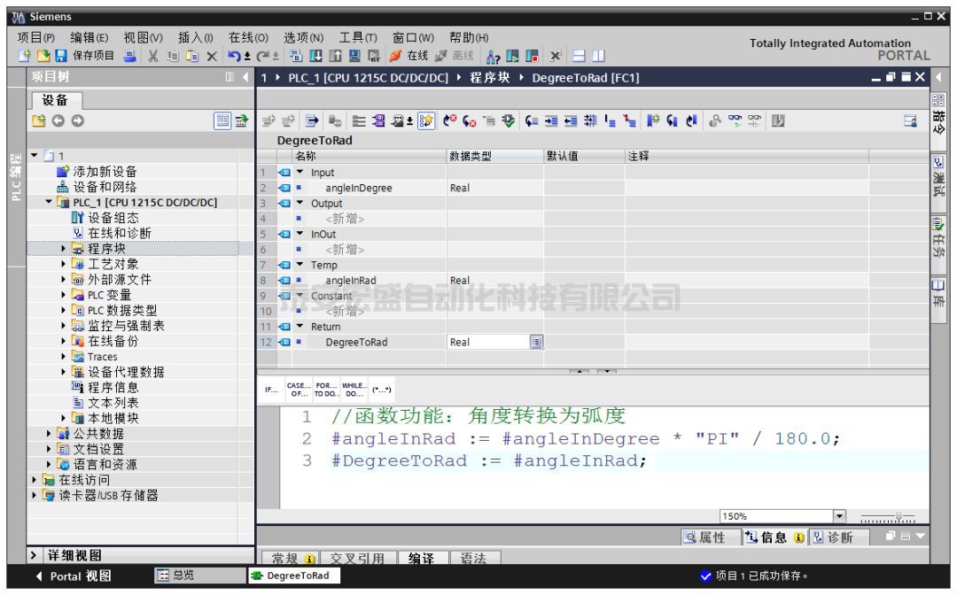 下面我用一個(gè)很簡(jiǎn)單的進(jìn)行角度弧度轉(zhuǎn)換的函數(shù)為例來(lái)說(shuō)明如何在 STEP 7 中自定義函數(shù)。