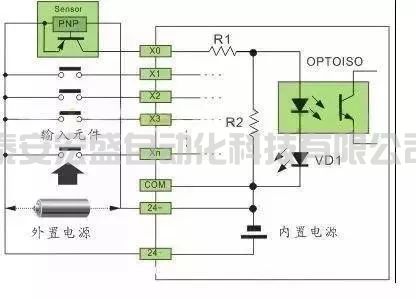 SOURCE源型為電流從輸入端流進(jìn),那么輸入端與電源正極相連即可,說明接口內(nèi)部的光電耦合器為單端共點(diǎn)為電源負(fù)極,可接PNP型傳感器。