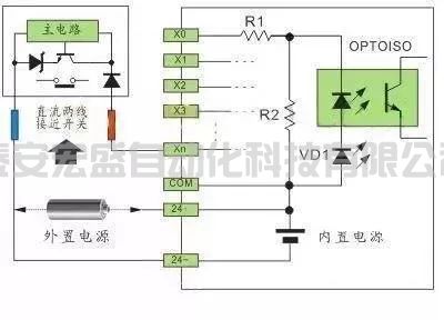 直流電可以由PLC內(nèi)部提供也可以外接直流電源提供給外部輸入信號(hào)的元件。R2在電路中的作用是旁路光電耦合器內(nèi)部LED的電流,保證光電耦合器LED不被兩線制接近開關(guān)的靜態(tài)泄漏電流導(dǎo)通。