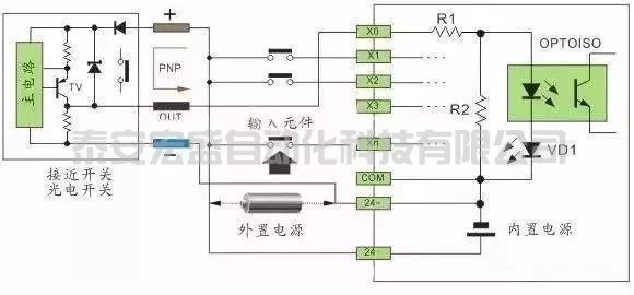 (外部輸入組件可以為按鈕開關(guān)、行程開關(guān)、舌簧開關(guān)、霍爾開關(guān)、接近開關(guān)、光電開關(guān)、光幕傳感器、繼電器觸點(diǎn)、接觸器觸電等開關(guān)量的元件。)