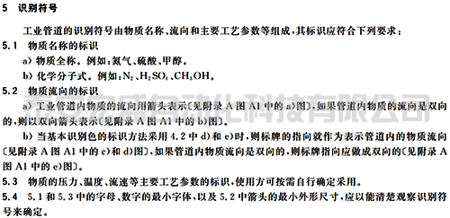 當(dāng)采用②③④⑤方法時(shí),二個(gè)標(biāo)識(shí)之間的最小距離應(yīng)為10m,③④⑤的標(biāo)牌最小尺寸應(yīng)以能清楚觀察識(shí)別色來(lái)確定。當(dāng)管道采用②③④③基本識(shí)別色標(biāo)識(shí)方法時(shí),其標(biāo)識(shí)的場(chǎng)所應(yīng)該包括所有管道的起點(diǎn)、終點(diǎn)、交叉點(diǎn)、轉(zhuǎn)彎處、閥門和穿墻孔兩側(cè)等的管道上和其他需要標(biāo)識(shí)的部位。