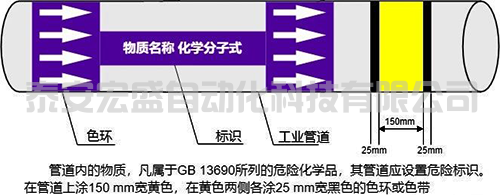 適用范圍:管道內(nèi)的物質(zhì),凡屬于GB13690所列的危險(xiǎn)化學(xué)品,其管道應(yīng)設(shè)置危險(xiǎn)標(biāo)識(shí)。