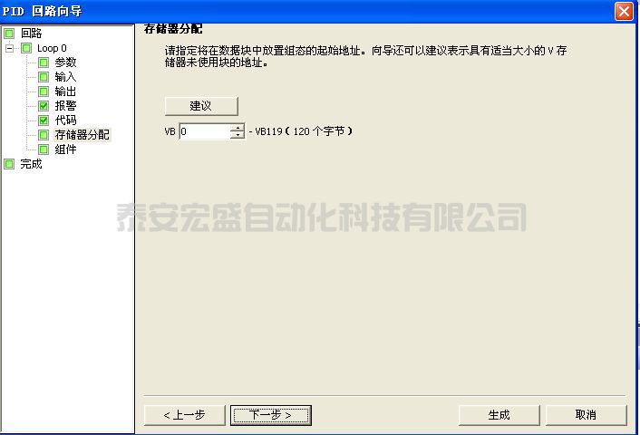PID指令(功能塊)使用了一個120個字節(jié)的V區(qū)參數(shù)表來進行控制回路的運算工作;除此之外,PID向?qū)傻妮斎?輸出量的標準化程序也需要運算數(shù)據(jù)存儲區(qū)。需要為它們定義一個起始地址,要保證該地址起始的若干字節(jié)在程序的其它地方?jīng)]有被重復使用。如果點擊“建議”,則向?qū)⒆詣訛槟阍O(shè)定當前程序中沒有用過的V區(qū)地址。