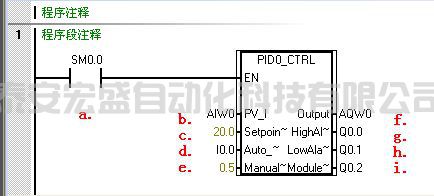 - 此處用I0.0控制PID的手/自動方式,當I0.0為1時,為自動,經(jīng)過PID運算從AQW0輸出;當I0.0為0時,PID將停止計算,AQW0輸出為ManualOutput(VD4)中的設(shè)定值,此時不要另外編程或直接給AQW0賦值。若在向?qū)е袥]有選擇PID手動功能,則此項不會出現(xiàn)