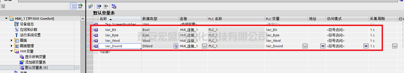 在HMI變量表中創(chuàng)建對(duì)應(yīng)的變量。