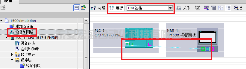 在“設(shè)備和網(wǎng)絡(luò)”中單擊選擇“連接”,選擇“HMI連接”,將相同顏色的端口進(jìn)行拖拽,從而創(chuàng)建集成連接“HMI_連接_1”。