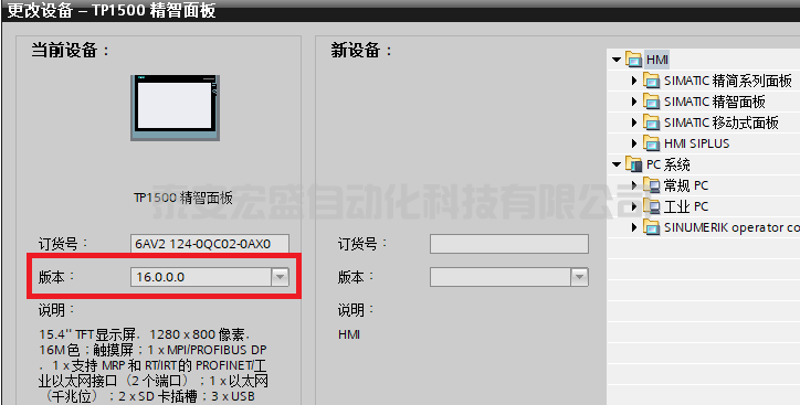 在項(xiàng)目中添加新設(shè)備-> HMI-> SIMATIC 精智面板->15” 顯示屏-> TP1500 Comfort 。