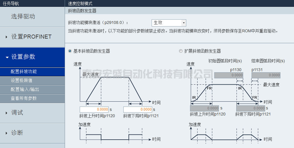 由于 S7-1200 軸工藝對象中已經(jīng)組態(tài)了軸運(yùn)行的加減速時(shí)間,所以在SINAMICS V-ASSISTANT 側(cè)激活斜坡功能模塊并將斜坡上升時(shí)間和斜坡下降時(shí)間設(shè)置為 0.0000 S