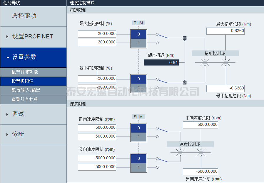 - 設(shè)置限值:扭矩和速度參數(shù)查閱電機(jī)銘牌或手冊填寫。