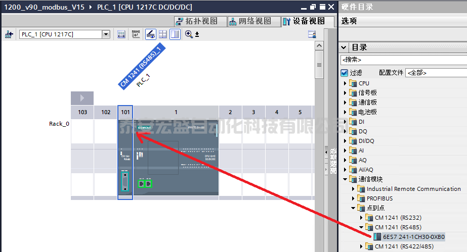 (1) 在設(shè)備視圖中將實(shí)際使用的通信模塊拖入到畫面中
