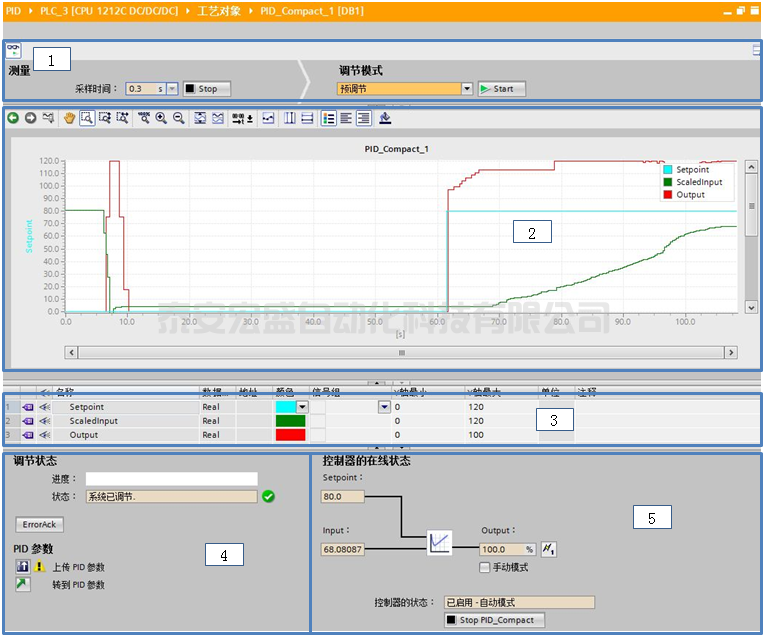 d. 若當(dāng)進(jìn)度條達(dá)或控制器調(diào)節(jié)功能看似受阻時,請單擊“調(diào)節(jié)模式”中(上圖部分 1)的 “Stop” 圖標(biāo)。檢查工藝對象的組態(tài),必要時請重新啟動控制器調(diào)節(jié)功能。
