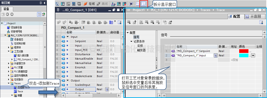 b. Trace > 配置窗口 > 信號 > 添加變量,窗口拆分顯示后使用拖放操作添加“信號”